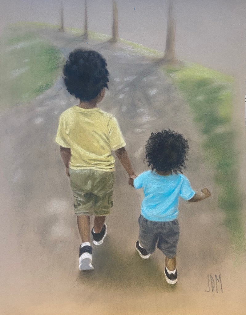 I don’t put them in first as many artists recommend. Here I used a paintbrush to blur the grass and walkway so my subjects would stand out. Had I drawn the background first I may not have done that, it was something that just developed.