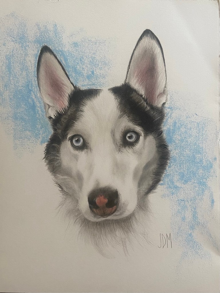 I like to use standard size paper because people can frame the pieces more easily then, but sometimes the photo does not fit well on the page as in the case below. I always leave a 1 inch border, but in this case, leaving an inch above, and below, left more than an inch of blank space on the sides. I used blue pastel chalk to help me eliminate so much of the white space. I may incorporate this into more of my portraits. I like how it looks and it adds a pop of color.